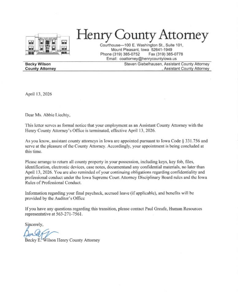 On April 13th, the Board approved the hiring of an outside, part-time attorney to assist with outstanding Freedom of Information Act requests, citing ongoing staffing shortages within the office. Also on April 13th, Liechty was served a notice of termination, effective immediately. That same day, the Henry County Board of Supervisors approved an employee separation agreement for Assistant County Attorney Steven Giebelhausen. Under the terms of the agreement, Giebelhausen will continue working through April 30th, while receiving salary, accrued vacation, and benefits through July 31st, totaling approximately $26,400.