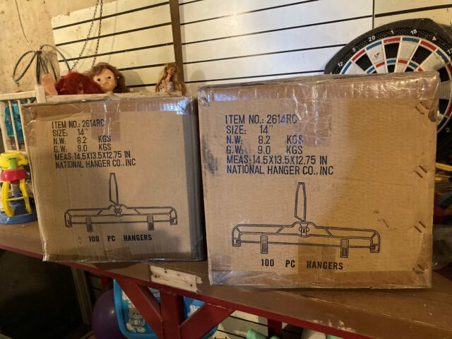 FOR SALE...Skirt hangers hang over the regular blouse/shirt hangers. Save space in your closet. 100 per box, all new, boxes never opened! $7 per box or $10 for both boxes. CALL 319-217-8371 if interested, if no answer please leave a voicemail and i will call you back. Thanks!