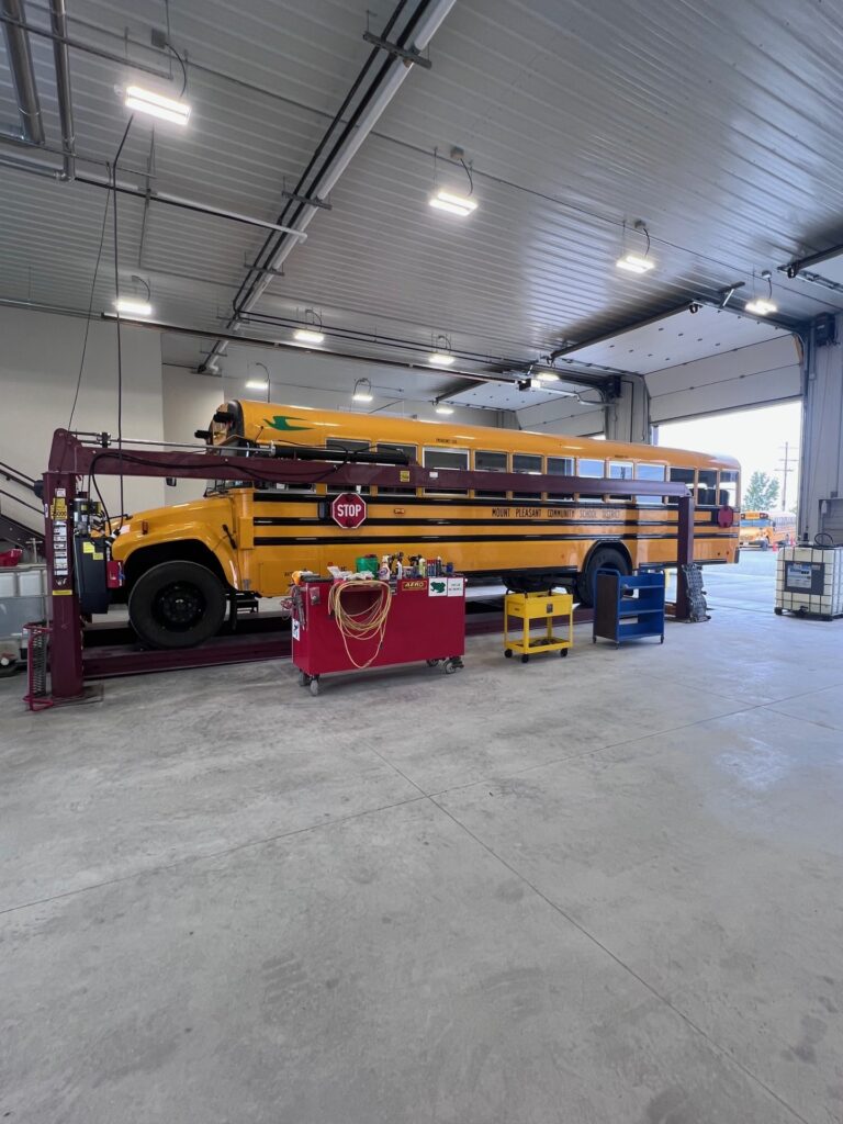 One of the highlights of the new building is the upgraded transportation station, which now includes equipment many districts don’t have. The new bus lift system, for example, allows mechanics to raise a bus eight feet into the air for maintenance—a first for the district.