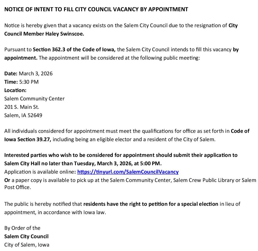 Under Iowa law, the council intends to fill the open seat by appointment. That appointment will be considered during a public meeting on March third at five-thirty p.m. at the Salem Community Center, located at two-oh-one South Main Street.