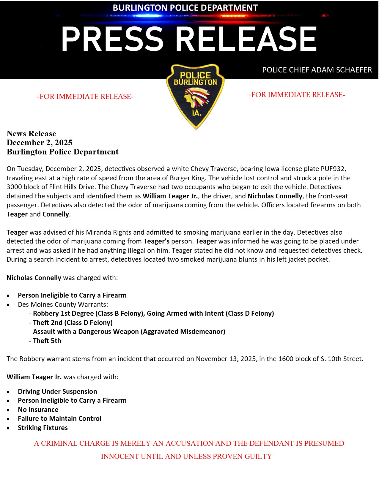 Nicholas Connelly is already facing multiple felony charges, including first-degree robbery, following a November armed robbery and a December police chase that ended in a crash. He remains held at the Des Moines County Jail on a 122-thousand-dollar cash-only bond. Teager is being held on a 10-thousand-dollar cash-only bond, while Alex Connelly has posted bond and waived his preliminary hearing.