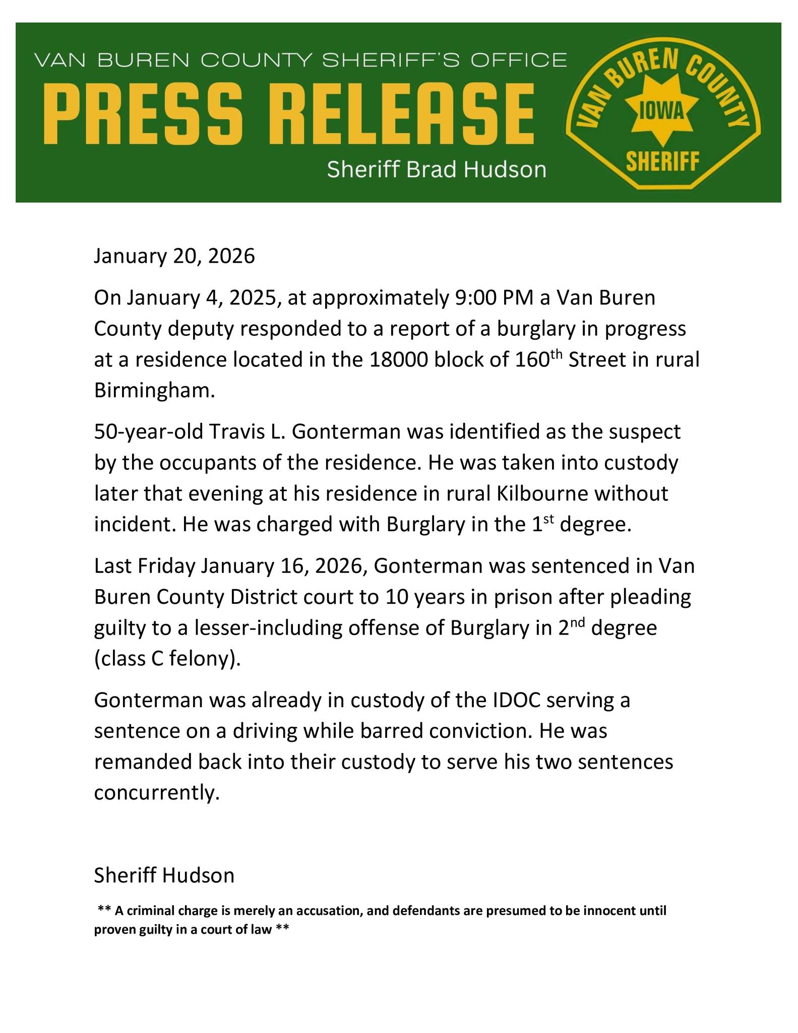 Court records show that on January 16, 2026 Gonterman was sentenced in Van Buren County District Court to ten years in prison after pleading guilty to a lesser charge of second-degree burglary, a class C felony.