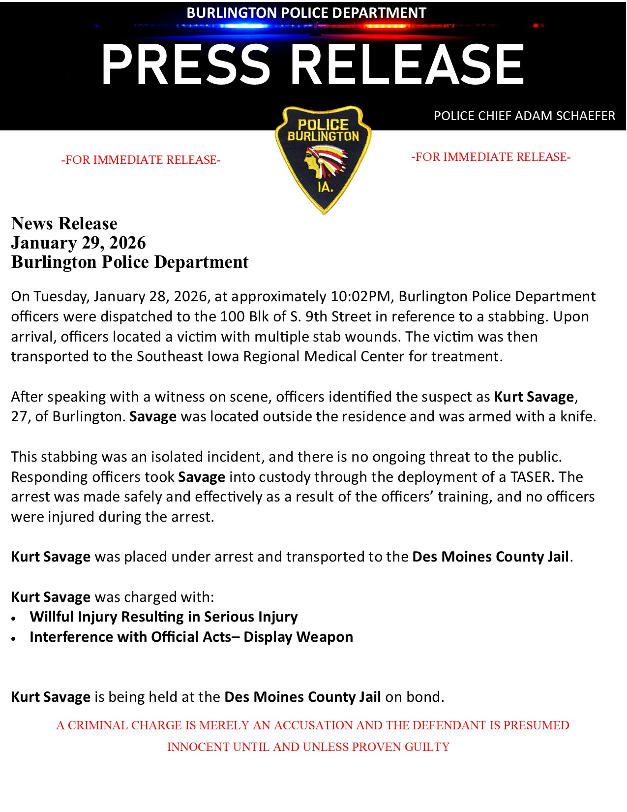Savage was transported to the Des Moines County Jail. He is charged with willful injury resulting in serious injury and interference with official acts while displaying a weapon. He is currently being held on bond.